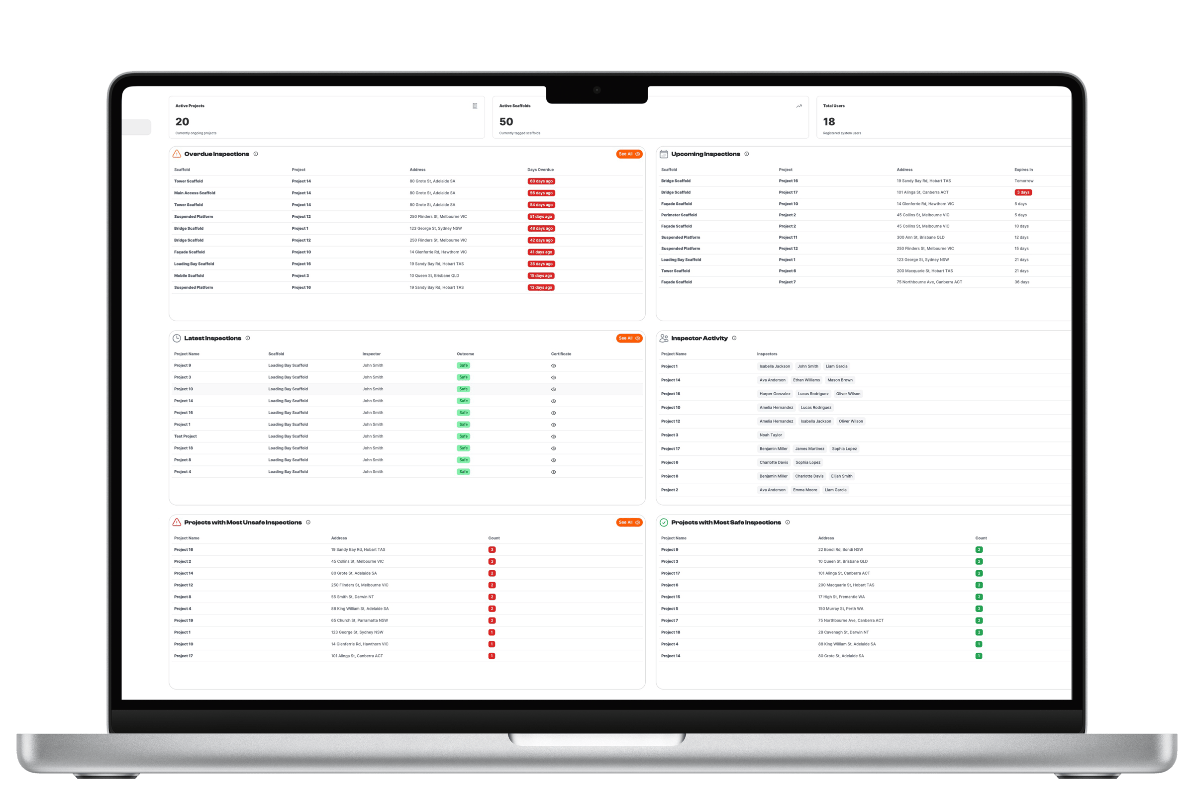 Your new command centre for inspections. Track everything that matters in one glance, from overdue and upcoming inspections to the latest results and inspector activity. Quickly spot projects with the most unsafe or safest inspections and dig deeper with “See All” to search, filter, or export data to Excel. Whether you’re monitoring trends or chasing overdue checks, the Web Dashboard keeps your entire operation visible and under control.