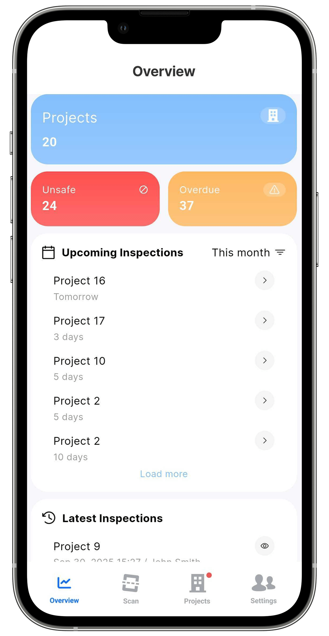 Reporting just got faster. The new mobile Overview screen puts key inspection insights front and centre the moment you log in, no more diving straight into “Scan.” See counts of unsafe and overdue inspections, explore upcoming schedules by day or week, and access the latest handover certificates instantly. It’s the quickest way to stay informed and act on the go.